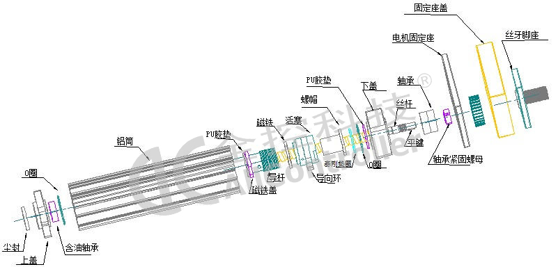 Mechanics電動缸主要由伺服電機、滾珠絲杠、絲杠支撐、缸筒、活塞桿、同步帶輪等組成,主要部件的功能如下: